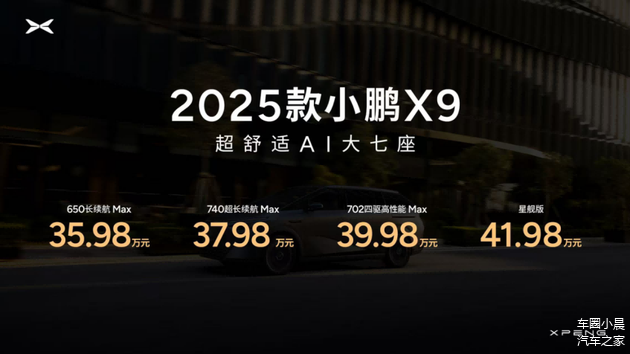 发布会上,全球旗舰、超舒适AI大七座2025款小鹏X9正式上市,新车共发布四个版本,包括650长续航Max、740超长续航Max、702四驱高性能Max以及星舰版,官方指导售价分别为35.98万元、37.98万元、39.98万元以及41.98万元。至2025年6月30日(含)前支付5000元定金的用户,可享购车好礼、置换复购礼、交付礼、无忧用车礼等多重上市订购权益。小鹏汽车还贴心回馈老款小鹏X9车主,通过硬件OTA的形式免费升级百万级的静谧性OTA套装、限时付费升级过道版零重力太空座椅套装、限时众筹升级流媒体内后视镜OTA套装以及智能电动遮阳帘OTA套装,诚意满满。