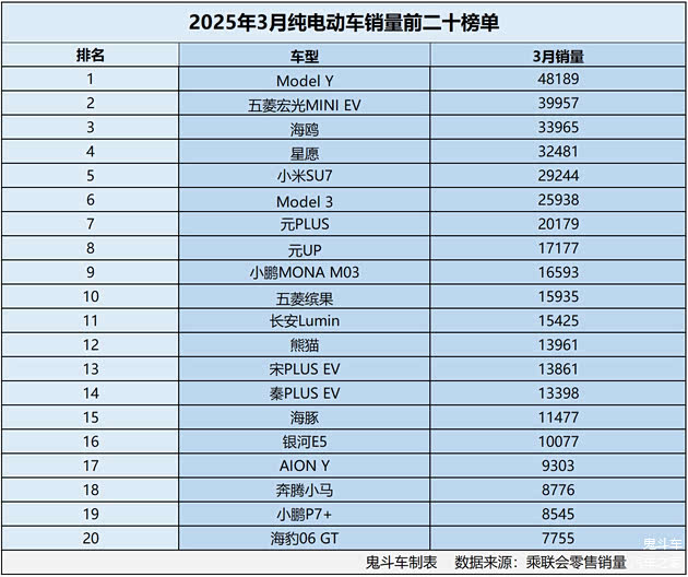 整体销量很强势,那么,消费者选购时该如何下手?为了让网友们看得更清楚,鬼哥根据乘联会零售销量数据整理出3月纯电车销量排名前二十的榜单,接下来,看看哪些车型榜上有名?