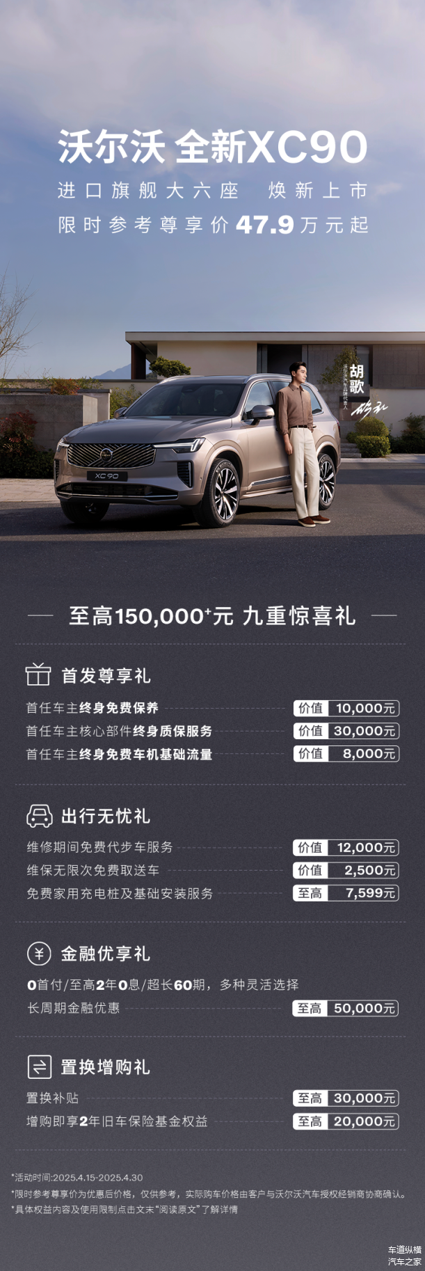 4月15日,沃尔沃汽车以“安全、健康、环保”为核心,正式宣布全新XC90豪华旗舰SUV上市。新车提供B5、B6及T8插电混动共5款配置,限时尊享价47.9万元起,同步推出“至高15万元九重礼遇”及“十二大全心服务承诺”,携手品牌代言人胡歌,为消费者带来全方位的优质体验。以全维升级的产品力与用户权益,重新定义中大型豪华SUV市场标准。