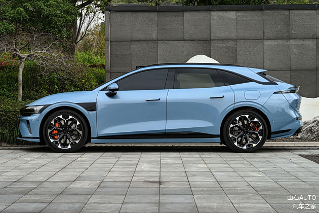 车身侧面相比三厢版车型来说比例更协调,硬朗的腰线从车头一直贯穿至车尾,视觉上拉伸了整车的长度,悬浮式车顶让车身侧面看起来更时尚,为了增加运动感,车窗边框以及车顶行李架都进行了熏给处理,包围也增加了黑色的装饰,看起来更有层次感。无框式车门有一种超跑的感觉,搭配隐藏式门把手设计,让这辆车成为了一件时尚“单品”,车身尺寸方面的长宽高分别为:4864/1900/1460mm,轴距为2925mm,与之匹配的是19英寸轮毂,透过轮毂可以看到红色的刹车卡钳,因为极氪007GT的加速非常快,所以需要优秀的刹车才能缩短刹车距离。