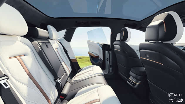 第二排的空间也很宽敞,身高178厘米的男生坐在后排,腿部空间有两拳半左右的距离,头部空间有一拳半左右的距离,座椅的填充物也很厚实,表面用真皮进行包裹,即使长时间乘坐也不会感到疲惫,在后排还具有独立空调出风口和全景天幕,提升了乘坐舒适性。