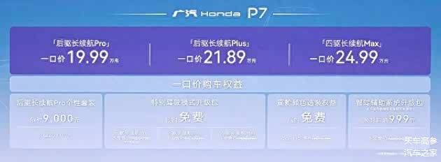 广汽本田P7提供单电机后驱和双电机四驱两大动力类型,共3个版本。其中,后驱长续航Pro版一口价19.99万元,后驱长续航Plus版一口价21.89万元,四驱长续航Max版一口价24.99万元。