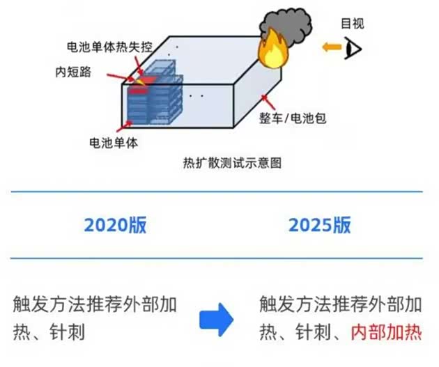 而现在的2025版新标准下,将热失控后不起火、不爆炸的时间延长到了2小时,且要求温度低于60℃,就是为了给乘员逃生、车辆救援留出更长的窗口期。