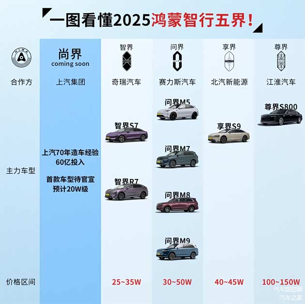 最新消息显示,尚界超级工厂首期斥资60亿元,目前已经有了5000+人的尚界专属团队,第一台车定位为20万元级别的紧凑型SUV,将在2025年秋季正式上市。此次尚界品牌正式发布后,将与问界、智界、享界、尊界共同组成鸿蒙智行,不仅大大拓宽了鸿蒙智行出行版图,更将满足多元、广泛的市场需求。