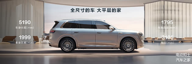 具体规格方面,新车尺寸为5190*1999*1795mm,轴距为3105mm,与问界M9接近,对比同级竞品有很大的空间优势。