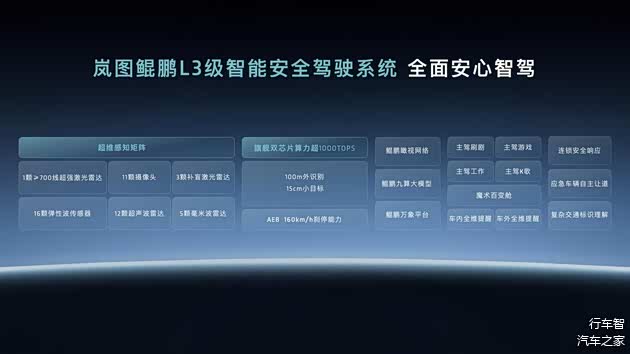 岚图汽车通过智能架构技术的创新,全面拥抱高阶智驾技术,为用户带来更安全、更智能的驾驶体验。鲲鹏L3级智能安全驾驶系统,具备鲲鹏瞰视网络、鲲鹏九算大模型和鲲鹏万象平台3大核心模块,可支持智驾系统能更高效地应对复杂场景,提供更安全、智能且懂用户的出行体验。