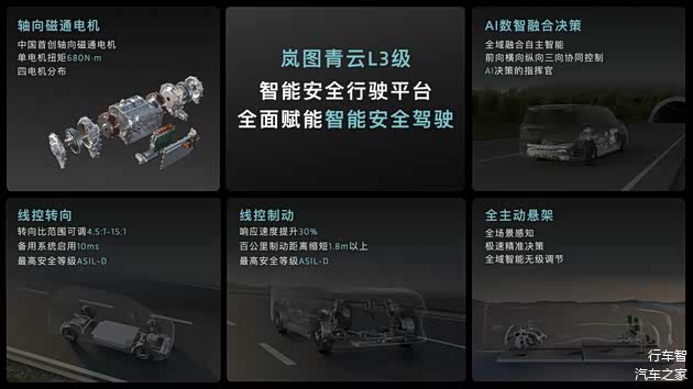 岚图的L3级智能安全行驶平台,以智能驾驭安全为理念,以数字驾控平台为核心,结合轴向磁通电机、分布式电驱、线控转向、线控制动、后轮转向、全主动悬架等先进技术,实现由电控架构向智能架构的跃迁,让产品体验更安全、更智能、更舒适。