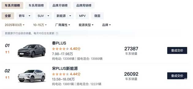靠成本管理,冲击最热价格段在C系列托举零跑登顶新势力后,B系列成为零跑打出的的下一张王牌,这也意味着零跑将直面最热价格段的竞争。零跑的产品规划是ABCD四个系列,分别涵盖了6-10万元、10-15万元、15-20万元、20-30万元四个价格带。B系列是零跑2025年的重中之重,零跑董事长朱江明公开表示,他们希望在2025年把B系列做透,把10-15万元价格带的产品做到最有竞争力,轿车B01将在4月份上海车展发布,两厢车B05将在慕尼黑车展发布。10-15万元的细分市场是中国当前份额最大、竞争最激烈的细分市场。以“性价比”为卖点的零跑,这一次面对的是同样以“性价比”著名、却在规模上远超零跑的对手——比亚迪。根据汽车之家3月的销量排行,10-15万元价格带的前十名车型中,有5个都来自比亚迪,其中秦PLUS和宋PLUS新能源夺得冠亚军。
