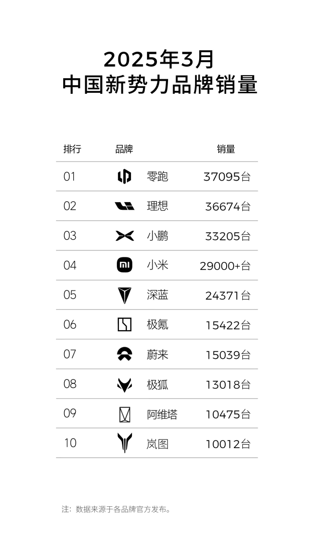 进入2025年国内新能源汽车市场的竞争,已经开始逐渐从价格战升级到了“智驾”战。而尽管竞争的激烈程度加剧,在造车新势力中,零跑汽车依然抢占了先机,3月份共计交付新车37095台,夺得造车新势力的榜首位置。