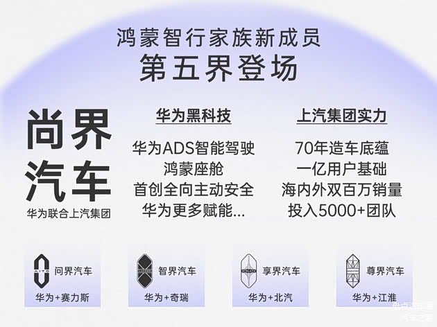 值得一提的是,上汽集团为尚界项目组建了超 5000 人的专业运营及技术团队,与华为工程师开展全生态链深度合作,从产品定义、造型设计、智舱智驾,到生产制造、销售服务等各个环节,都力求做到精益求精。上汽集团还将整合集团优质资源,确保尚界从诞生之初便具备行业顶尖的品质基因和技术实力。