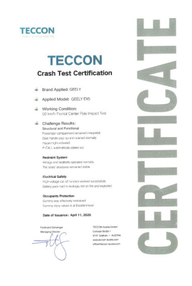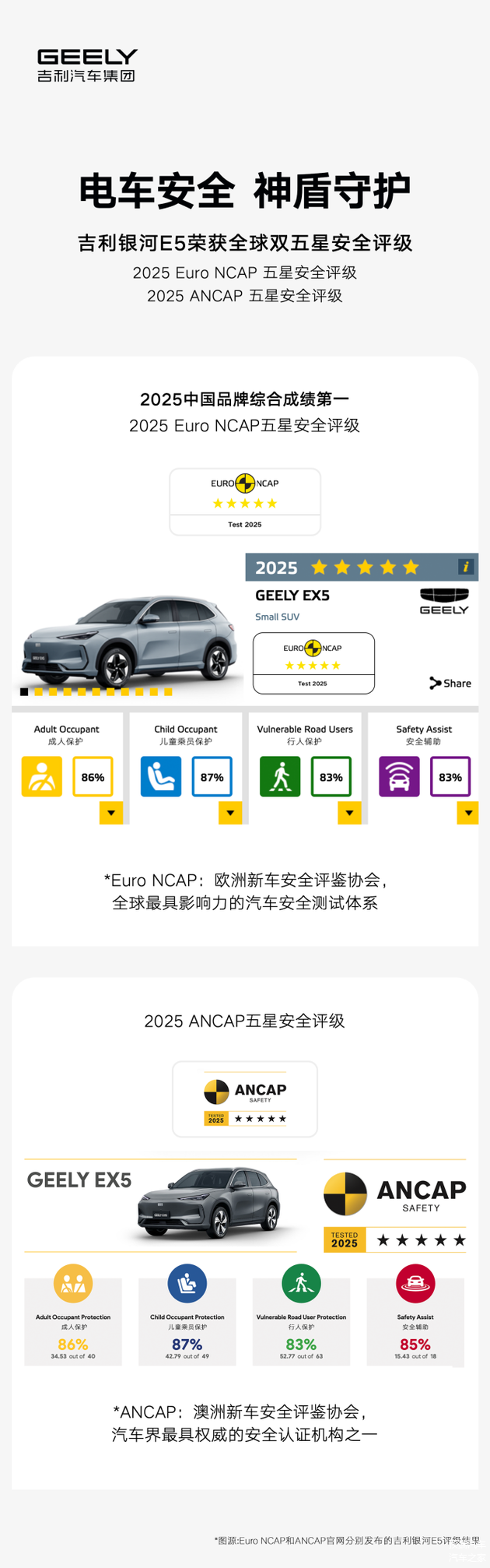 除了成功挑战50km/h中心柱碰试验,吉利银河E5此前还获得了“全球双五星”的最高安全认证,成为目前唯一获得Euro NCAP和ANCAP“双五星”安全评级的15万级中国品牌纯电SUV,安全性得到了全球权威印证。