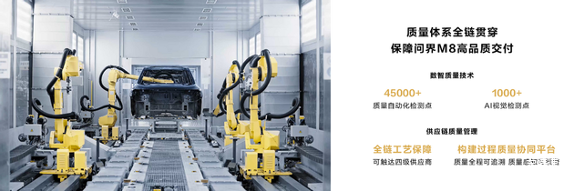 为了保障问界M8高品质交付,问界实现了从供应链到整车的全链条质量体系升级。整车方面,应用超45000个质量自动化检测点,以及超1000个AI视觉检测点,更好地实现全流程质量管理。在供应链方面,问界对全链工艺进行保障,可触达到四级供应商;并构建了供应链过程质量协同平台,与供应链共享核心技术与标准,全链质量可追溯、可预警,真正实现了“一车一档,一件一档”。