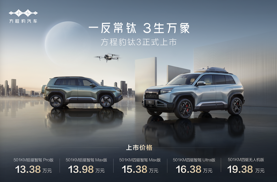 钛 3 从豹 3 改名而来,定位「潮酷新物种」,这意味着方程豹将在更亲民的价格区间,推出更丰富的产品矩阵。