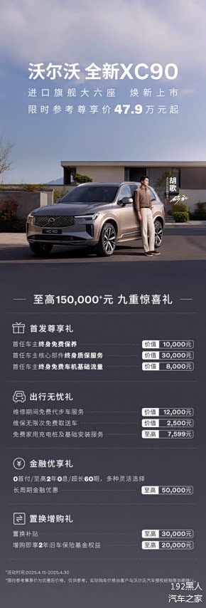 4月15日,进口旗舰大六座沃尔沃全新 XC90上市发布会在上海西岸艺术中心盛大举行。新车提供5个配置版本,限时参考尊享价47.9万元起,并提供总价值至高15万元的上市权益。沃尔沃汽车品牌代言人胡歌亲临发布会,与各界嘉宾共同见证沃尔沃全新XC90闪耀上市,共同开启豪华汽车领域全新篇章。