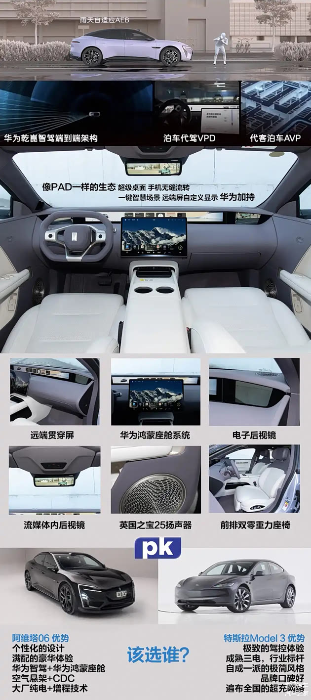 ●特斯拉Model 3:阿维塔06在车身尺寸上略大于Model 3 ,起售价相近 。阿维塔06搭载了由华为提供的先进智能驾驶系统,在中国市场可能在某些方面超越特斯拉的FSD 。此外,阿维塔06提供纯电和增程两种动力选择,而Model 3目前仅提供纯电版本 。