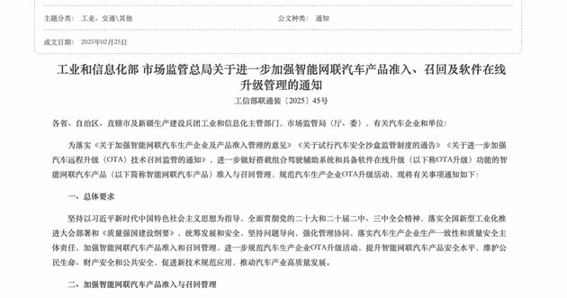 今年2月25日,工信部、市场监管总局发出通知,进一步加强智能网联汽车产品准入、召回及软件在线升级管理。提升智能网联汽车产品安全水平,维护公民生命、财产安全和公共安全,促进新技术规范应用,推动汽车产业高质量发展。