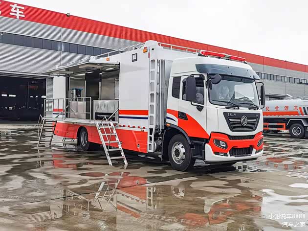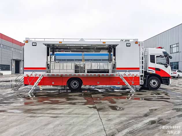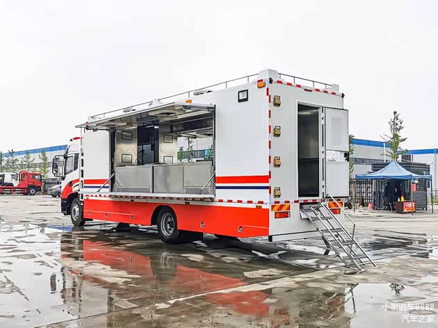 上装配置:箱体外部采用2mm铝平板、内部1.0不锈钢板,内部钢骨架+聚氨酯填充。箱体两侧可以展开、半展开作业,内设800升净水箱,200升污水箱,配炒菜灶,蒸饭柜,消毒柜,发电机,抽烟机罩,冰箱,柴油发电机,洗菜池和储物柜等。
