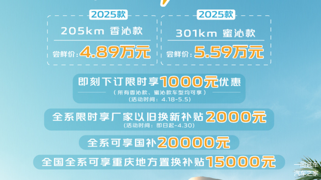 4月18日, 长安Lumin 2025款推出205km香沁款、301km蜜沁款两款新车型,尝鲜价分别为:4.89万元、5.59万元,全系可享国补2万元等福利。