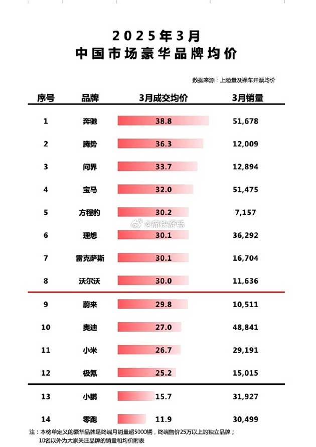 近日,2025年3月中国市场豪华品牌均价排行榜出炉,腾势汽车以成交均价36.3万元,超越宝马、奥迪、问界等,位列中国品牌均价第一!腾势汽车成交均价持续多月上榜豪华品牌TOP3,领势中国豪华品牌加速崛起!今年以来腾势汽车持续热销,3月份销量同比增长22.8%,展现出强劲的势头!