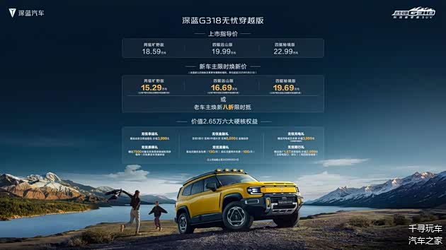 当城市SUV的舒适性与硬派越野的通过性成为不可调和的矛盾, 深蓝G318无忧穿越版以15.29万元起的焕新价(含国家以旧换新及麦麦专属限时福利后价格,截止至5月31日),给出了一个平衡方案。这款车通过精准的场景适配与技术下放,让“偶尔出逃”的都市人也能轻松拥抱户外生活。