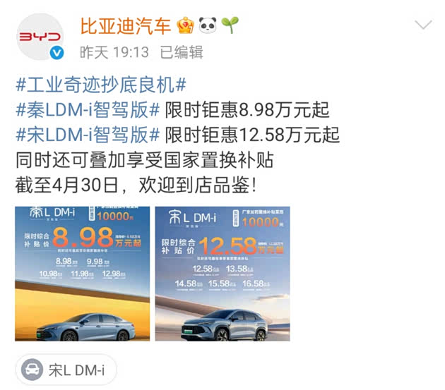 五天前,即4月11日,比亚迪针对秦PLUS系列推出置换升级限时优惠活动,秦PLUS DM-i智驾版综合补贴后起售价来到6.98万,秦PLUS EV智驾版综合补贴后起售价9.98万元。