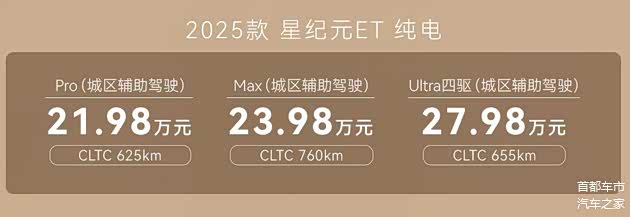 4月19日,2025款星纪元ET正式上市,新车提供增程、纯电双动力选择,提供两驱、四驱两种驱动形式,其中增程系列官方指导价格17.28-23.98万元,纯电系列官方指导价格21.98-27.98万元。