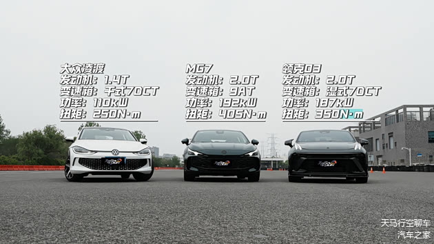 我们选用的都是终端成交价格在14万附近产品,大众凌渡是1.4T+7DCT(干式)版本,最大功率110kW,最大扭矩250N·m;MG7是2.0T+9AT版本,最大功率192kW,扭矩405N·m;领克03是2.0T+7DCT(湿式)版本,187kW,350N·m。