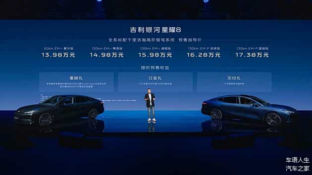 作为吉利银河品牌的电混豪华旗舰,吉利银河星耀8集结5米最美混动、5米3L油耗、满配豪华座舱,同级第一安全标准,首搭吉利最新科技,成就豪华设计、豪华电混、豪华座舱、豪华安全、豪华科技“五大豪华”,以媲美50万级豪华车的出行体验,在主流新能源用户群体中推动“豪华平权”,剑指中大型电混轿车市场头把交椅。