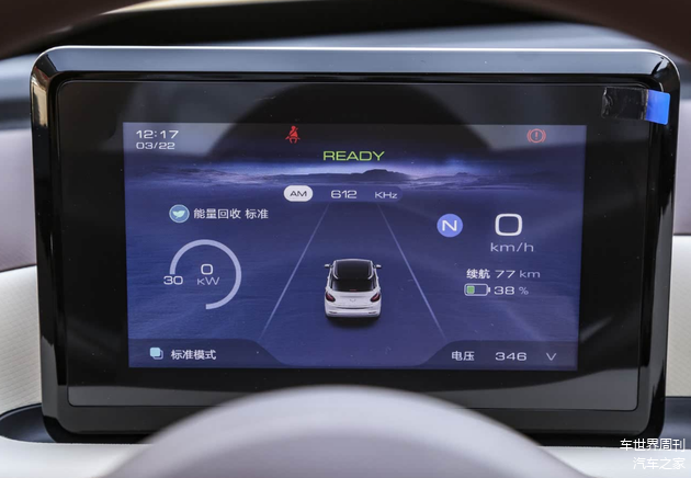 先说入门版203km轻享款,官方售价5.68万。虽然售价最低,但是配置水平不算太突出,除了动力、续航外,像自动驻车、上坡辅助、定速巡航、一键启动等实用配置都是缺席的,而且像织物座椅、2喇叭、7英寸液晶仪表、卤素大灯等配置水平也是全系最低的。