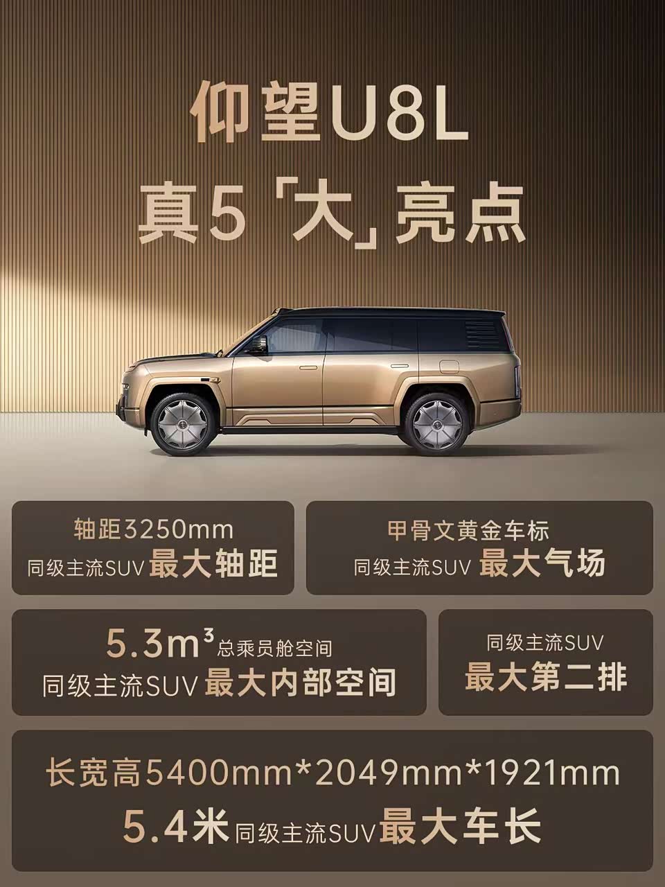 仰望U8L上海车展发布了 全尺寸行政豪华SUV 长宽高:5400mm*2049mm*1921mm,轴距:3250mm同级最大轴距 真金甲骨文黄金车标,23英寸 轮毂 ,上下对开式,电动尾门 易四方、 云辇-P、爆胎稳行、应急浮水、 原地掉头、“天神之眼A"驾驶辅助三激光版 这次的仰望U8L和谁比!劳斯劳斯库里南、揽胜盛世十周年高定版、2025揽胜盛世加长版、 GLS迈巴赫 大家觉得他赢了吗?