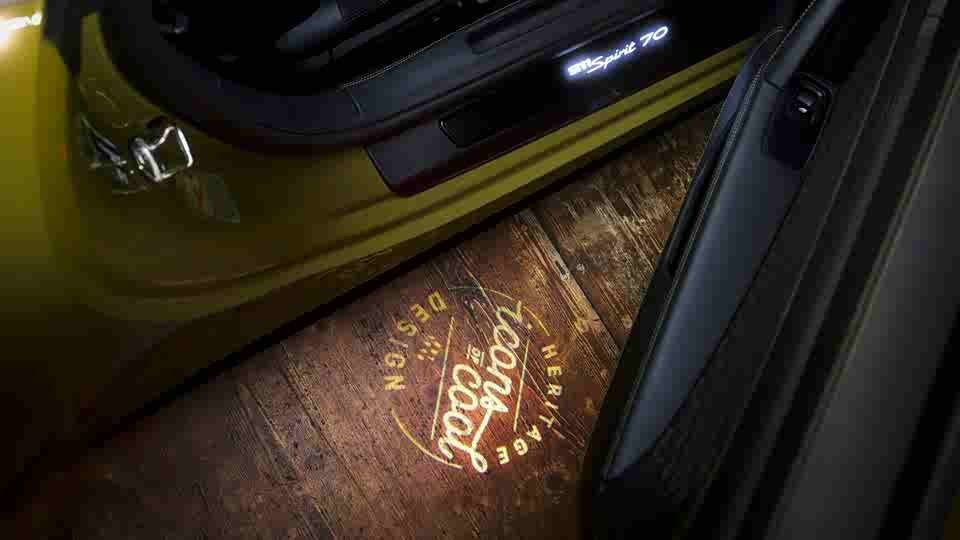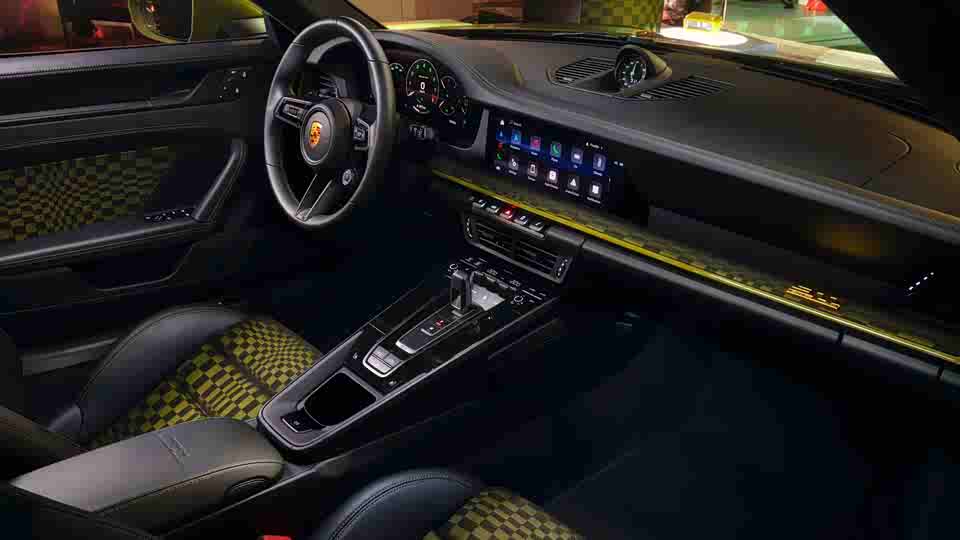 具体来看,911 Spirit 70特别版车型基于Carrera GTS Cabriolet开发,使用了独特的漆面涂装及全车大量定制Pasha图案,这一黑绿相间的棋盘格设计于上世纪 70 年代末首次亮相,随后成为保时捷最具标志性内饰风格之一。