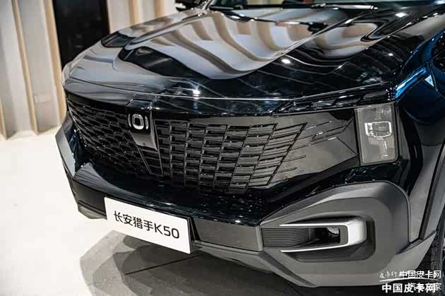 品鉴会现场展示车型为黑色喷涂,猎手K50全系不管任何配置与配色,中网都采用与车身同色喷涂,这一点与此前猎手有很大不同。上海车展媒体日当天展台上,展出了全新橄榄绿配色,这个车色独具特色,非常户外。车头设计延续长安经典的无边界结构,中网部分镂空的格栅采用密集浮雕图案,将两侧 LED 灯组与主头灯相连,长安品牌特征鲜明。