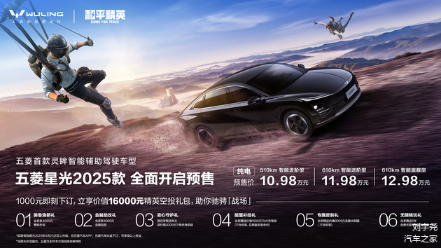 【2025年4月23日】年轻战场,总有星光。今日,五菱汽车在上海车展官宣五菱首款灵眸智能辅助驾驶车型——五菱星光2025款正式开启预售。本次预售提供510km智能进阶型、610km智能进阶型和610km智能旗舰型三款配置,预售价分别为10.98万元、11.98万元和12.98万元。以1000元下订,立享价值16000元精英空投礼包,包括装备焕新礼:全系享4000元置换补贴;金融助攻礼:全系享4000元金融贴息;安心守护礼:首任非营运车主享价值3000元三电终身质保;能量补给礼:全系赠送价值1500元7kW充电桩(不含安装,且具备安装条件);专属皮肤礼:全系赠送价值3000元龙膜太阳膜(不含安装);无限畅玩礼:全系赠送3年免费无限车机娱乐流量。