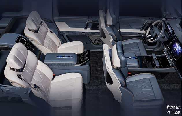 内饰方面,猛士M900星际战车以“龙吟”为主题,融合“战机”“龙鳞”“天际”等元素。车内配备了四座零重力航空座椅,提供极致舒适的乘坐体验。中控台区域延续了猛士917的布局,配备悬浮式仪表盘、中控屏和副驾驶屏,同时增加了大量绒面材质,提升了内饰的质感与豪华感。