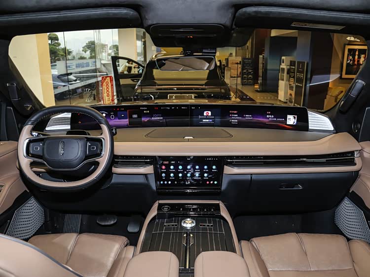 内饰以"日上斗金"为主题,中控台搭载由11.1英寸触控屏与48英寸环抱式4K屏组成的双联屏系统,支持Apple CarPlay/Android Auto双平台互联。中央通道区域采用水晶质感旋钮与按键式换挡组合,集成电子自动恒温空调(支持远程启动)及7种特调香氛系统。音响系统升级为28扬声器REVEL Ultima 3D沉浸式音响,标配ANC主动降噪技术。焕活舒享模式可通过中控屏联动座椅、香氛、氛围灯等系统,打造多感官放松体验。