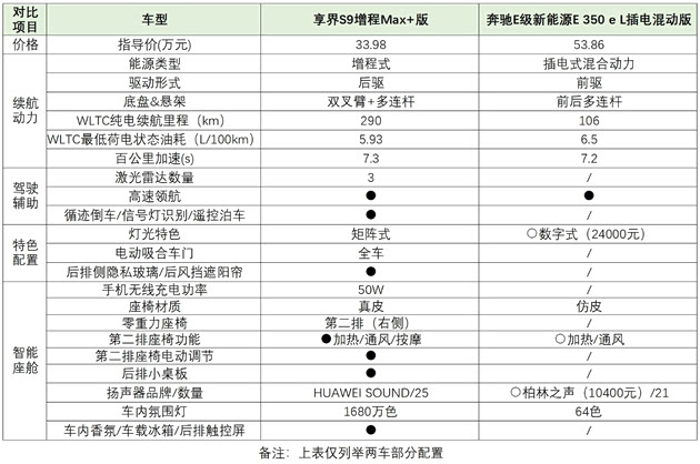 奔驰E级新能源E 350 e L插电混动版指导价53.86万元,终端优惠后也是33万多(各地优惠幅度不同,请以当地经销商报价为准),相当于享界S9增程版中配的价格,但配置丰富程度却远不如后者。