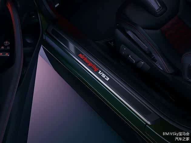 这款限量版M4还提供了个性化定制的“磨砂深绿”特别涂装、赤金铜色锻造双辐轮毂;迎宾踏板上有“nürburgring 1/53”的专属标识;前排M碳纤维桶形座椅则采用红黑搭配,头枕增加红色纽博格林赛道图案的刺绣。