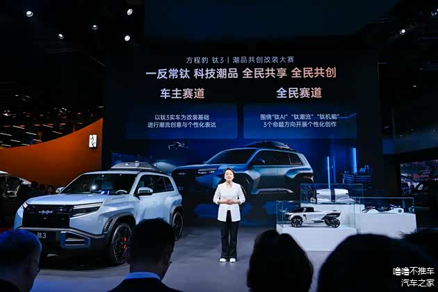 开展当日“比亚迪全球设计大赛颁奖典礼”也在方程豹展台举行,比亚迪携手5大顶级院校,选拔并赋能顶尖设计人才,共同探索汽车未来的更多可能。颁奖典礼现场,方程豹“钛3潮品共创改装大赛”正式开启,全民、车主两大赛道,官方更投入百万奖励,邀请所有的用户都来享受科技潮品钛3的无限创作乐趣。