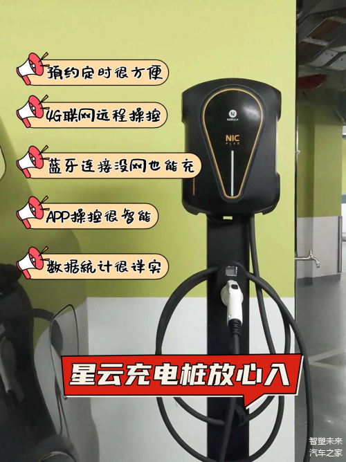 自购第三方:星云充电桩等(可以预约充电、4G联网远程操控、APP统计数据、闲时共享)