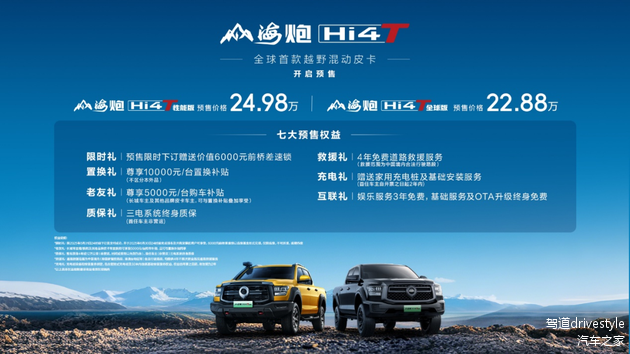 4月23日,“全球首款越野混动皮卡”山海炮Hi4-T正式开启全球预售。山海炮Hi4-T全球版官方预售价格为22.88万元,山海炮Hi4-T性能版官方预售价格为24.98万元,并同步推出限时礼、置换礼、充电礼等7大预售权益,价值拉满,诚意十足,保障用户用车无忧。