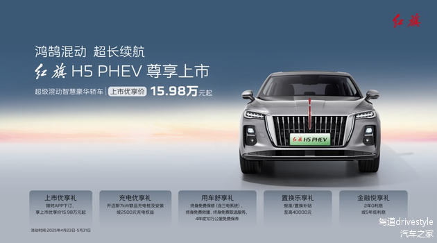 超级混动智慧豪华轿车红旗H5 PHEV同步上市,上市优享价15.98万起。作为中国品牌B级豪华轿车销量冠军家族车型新成员,红旗H5 PHEV基于全新鸿鹄平台打造,继承了红旗H5的经典造型、国车品质, 拥有1600公里以上的超长续航、13分钟超快的补能速度、3.75升超低的油耗表现,提供四种动力模式,完美满足了用户既要经典豪华、更要超级混动的热切期待。