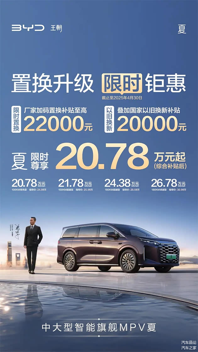 悄悄告诉你们,比亚迪夏到4月30日前还有限时钜惠宠粉活动,厂补2.2万,国补2万,综合补贴后20.78万起啦!趁活动没结束赶快去试驾吧,早下单早享受!