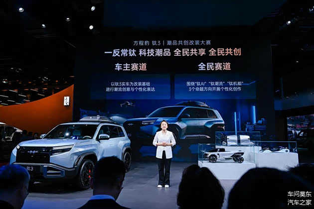 开展当日“比亚迪全球设计大赛颁奖典礼”也在方程豹展台举行,比亚迪携手5大顶级院校,选拔并赋能顶尖设计人才,共同探索汽车未来的更多可能。颁奖典礼现场,方程豹“钛3潮品共创改装大赛”正式开启,全民、车主两大赛道,官方更投入百万奖励,邀请所有的用户都来享受科技潮品钛3的无限创作乐趣。