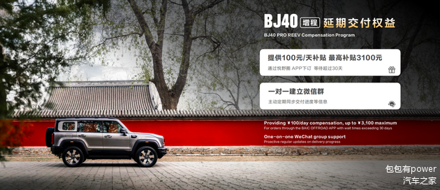 上市48小时内,BJ40增程订单突破万台,稳居增程方盒子细分市场榜首(市占率81%),新能源方盒子领域位列第一。针对交付延迟问题,品牌承诺超30天等待期每日补贴100元,最高3100元,并通过专属社群实时同步生产进度。