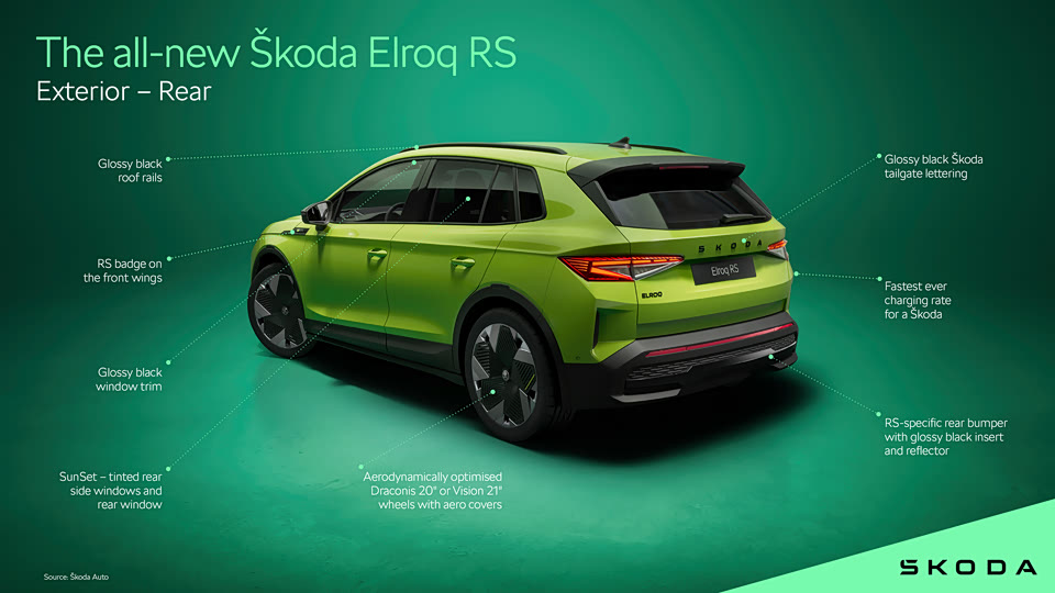 斯柯达Elroq RS,捷克厂牌当前最速量产车~ 紧凑级纯电SUV定位,带21英寸专属轮毂及RS车系风格装饰,双电机四驱设定,总输出340马力,零百加速5.4秒;电池容量84kWh,WLTP续航超550公里,支持最高185kW充电功率,另标配运动化底盘,可选DCC悬架。 云评:数据上不算很炸裂,但应该很多人都能Hold得住,还是那个观点,能够完全掌控才可以实现乐趣的最大化…… 🧾 Skoda #斯柯达# #电动车# #TC车闻#