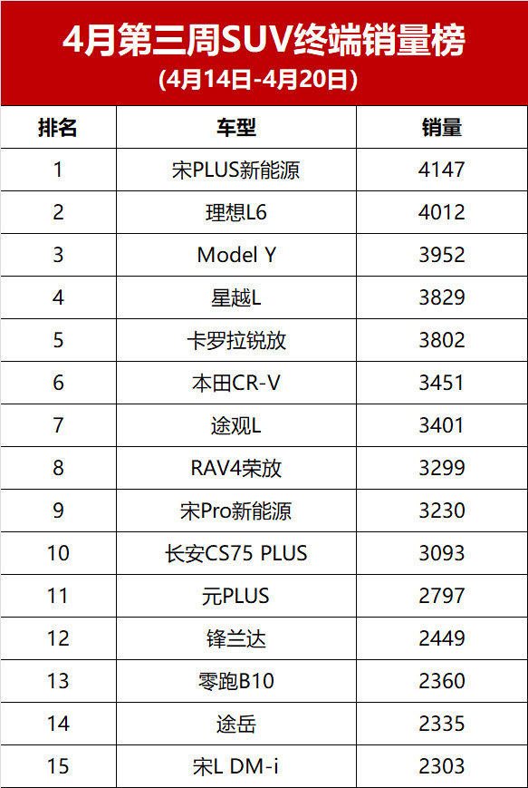 整体而言,2025年4月第三周的SUV终端销量排名,反映出当下汽车市场呈现多元化竞争态势。新能源车型持续发力,传统燃油车也在积极寻求突破,各品牌在不同细分市场各展所长。随着市场不断发展,消费者将有更多优质SUV车型可供挑选,而车企们也需持续创新、提升产品竞争力,以在激烈的市场竞争中抢占先机。