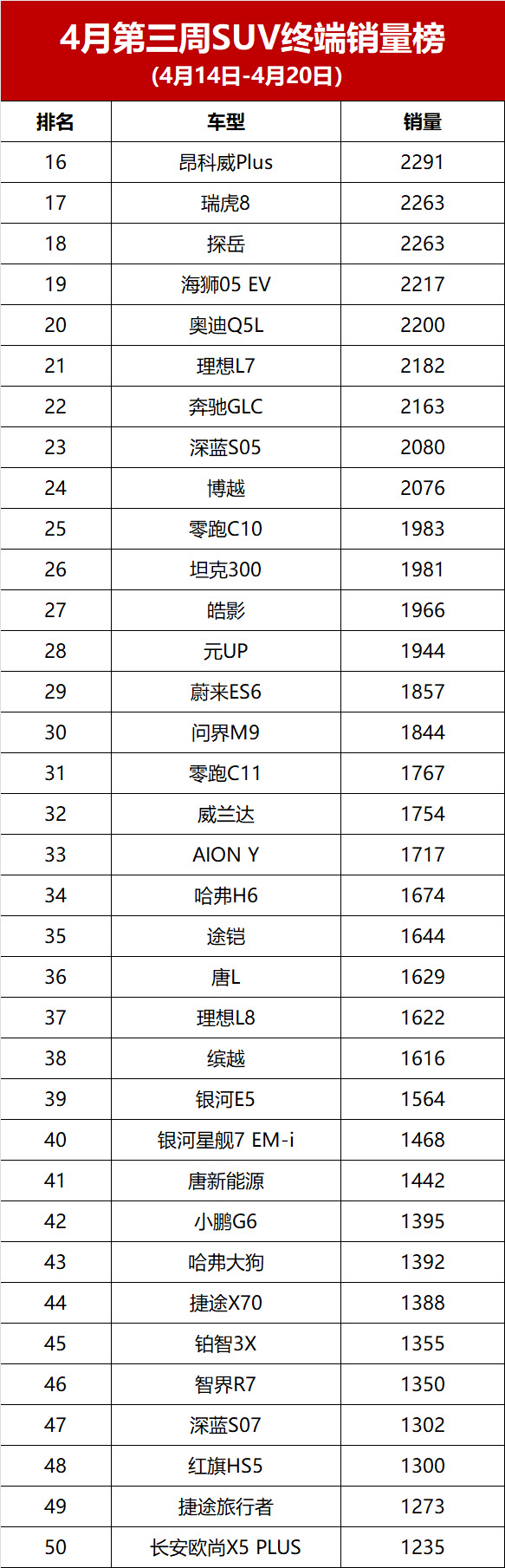 【2025年4月第三周SUV终端销量榜】上海车展前夕,国内SUV市场继续保持增长势头。据近日公布的最新销量数据显示,4月第三周(4月14-20日,2025年第16周)国内SUV市场终端销量前五十车型合计销量达到11.0万辆,环比上周增长14.2%,部分车型的销量排名也出现了较大变化。