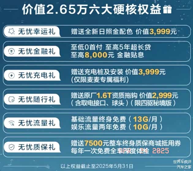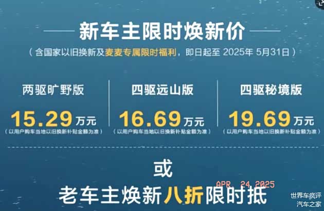 这次全新深蓝G318在各方面的升级还是挺大的,不仅有着强大的越野通过能力,还兼顾着更好的驾乘舒适性,并且这次它的价格政策非常给力,拥有老车主焕新八折限时抵,起步价15.29万,四驱顶配仅19.69万,还有2.65万六大硬核权益,像全新日照金车身配色都是免费送。