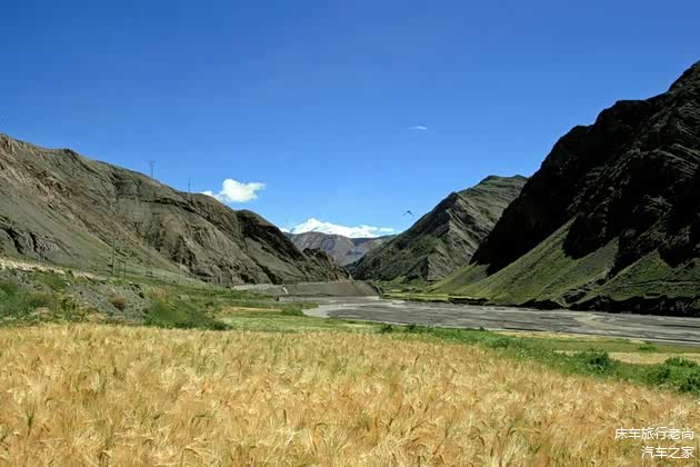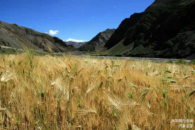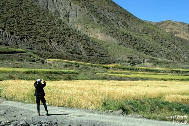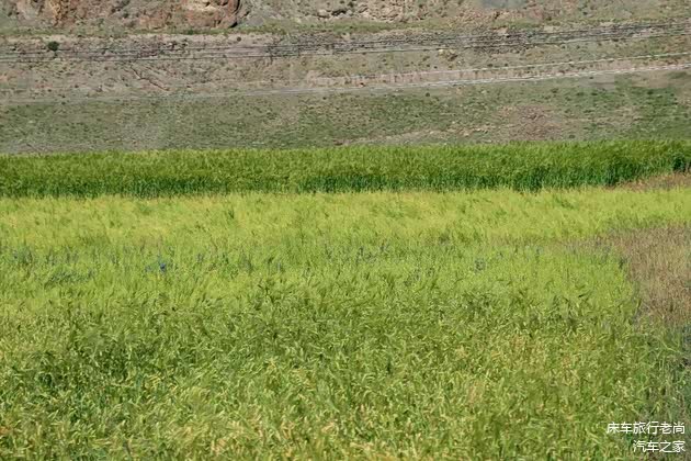 翻过了雪山眼前豁然开朗,一条大道延伸得很远很远,路旁时有老乡举着一串白色的东西,那是他们自制的奶酪,我受不了那个味道就没有买。下到了谷底就看到了河水,两旁种了大片的植物,停下车特意去看了看,原来都是青稞,这是头一次近距离地看青稞,如果不是在这里我会觉得和小麦差不多。让人惊奇的还有这里居然有大片的油菜花,这里的海拔可是在4600多米啊。