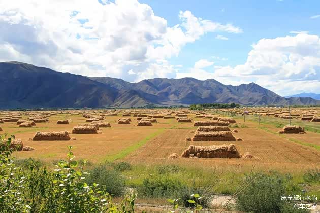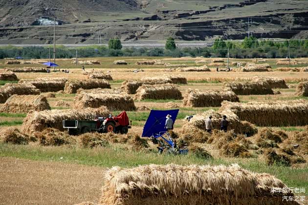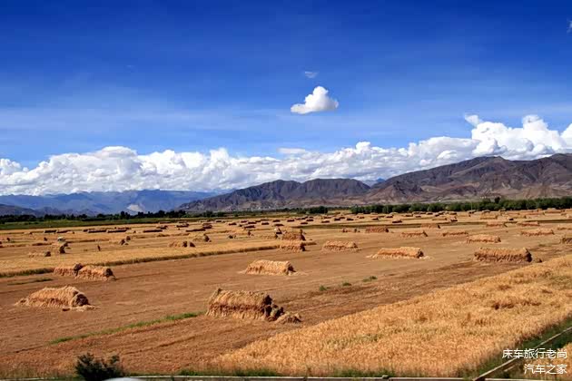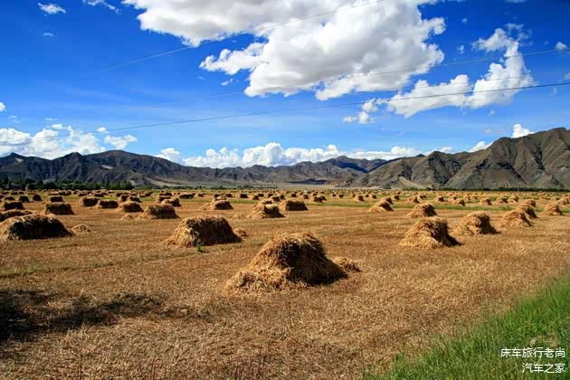 在去往拉孜的路上,这里的地势比较平缓,路的两侧是大片的成熟的黄色的青稞麦田,很多已经收割了,整齐的码成垛堆 排列在田野里,看到这些也会感到收获的喜悦。